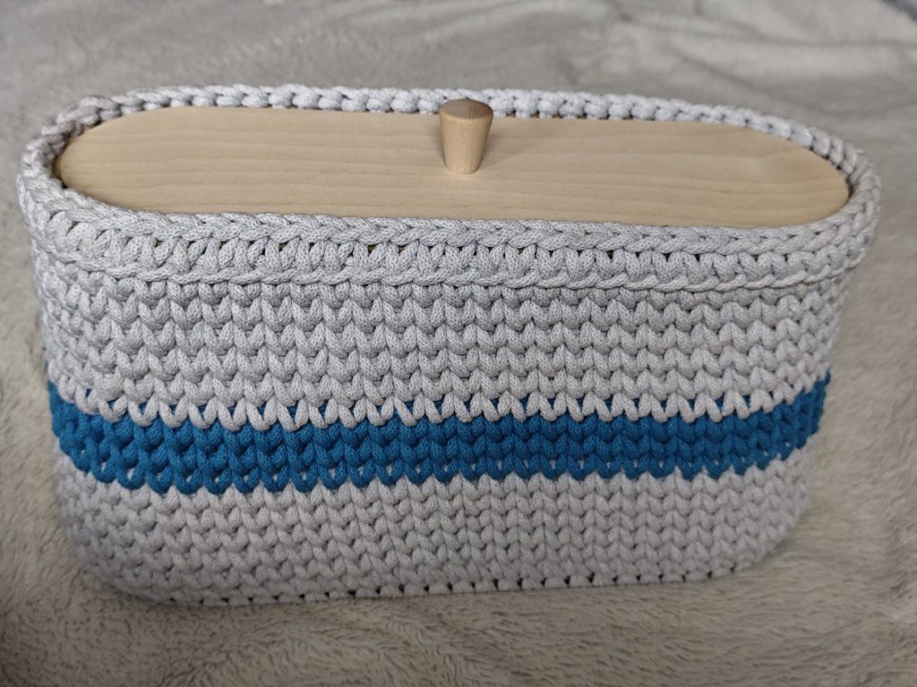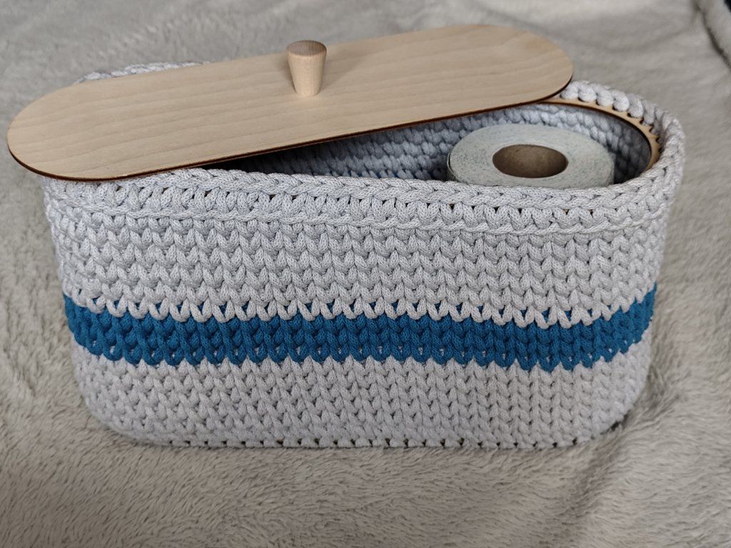Ručně háčkovaný úložný box je navržený tak, aby elegantně schoval až 6 roliček toaletního papíru a zároveň sloužil jako krásný doplněk interiéru. Díky kombinaci pevné příze a dřevěného víka drží tvar, působí čistě a uklizeně a ochrání obsah před prachem.