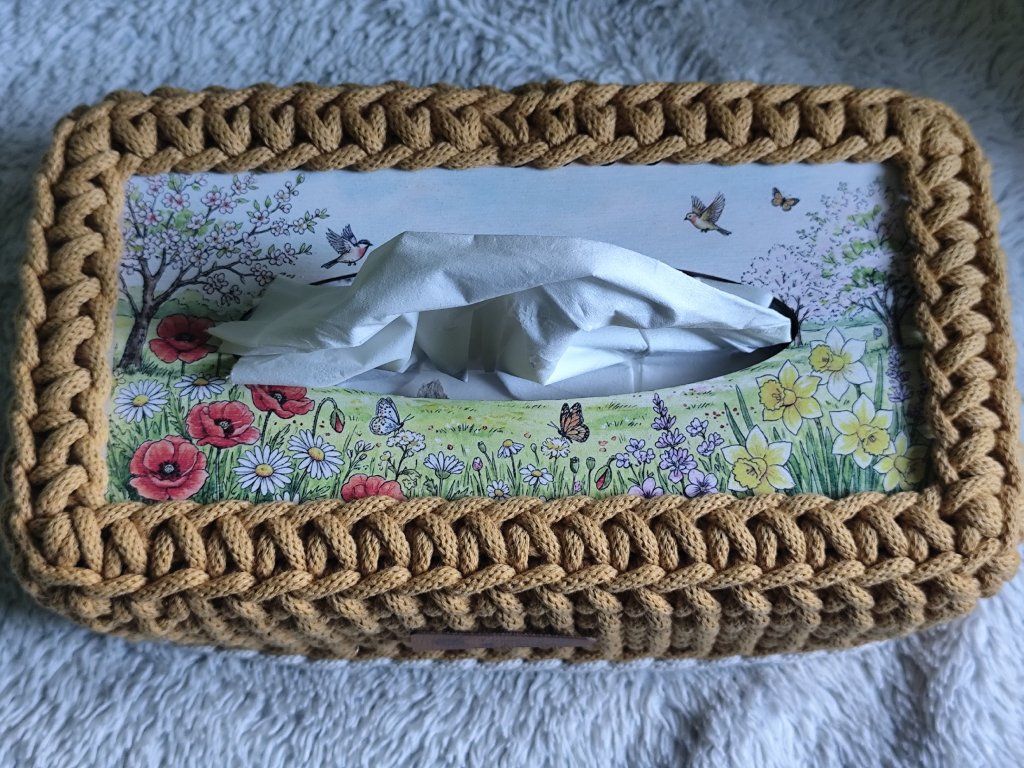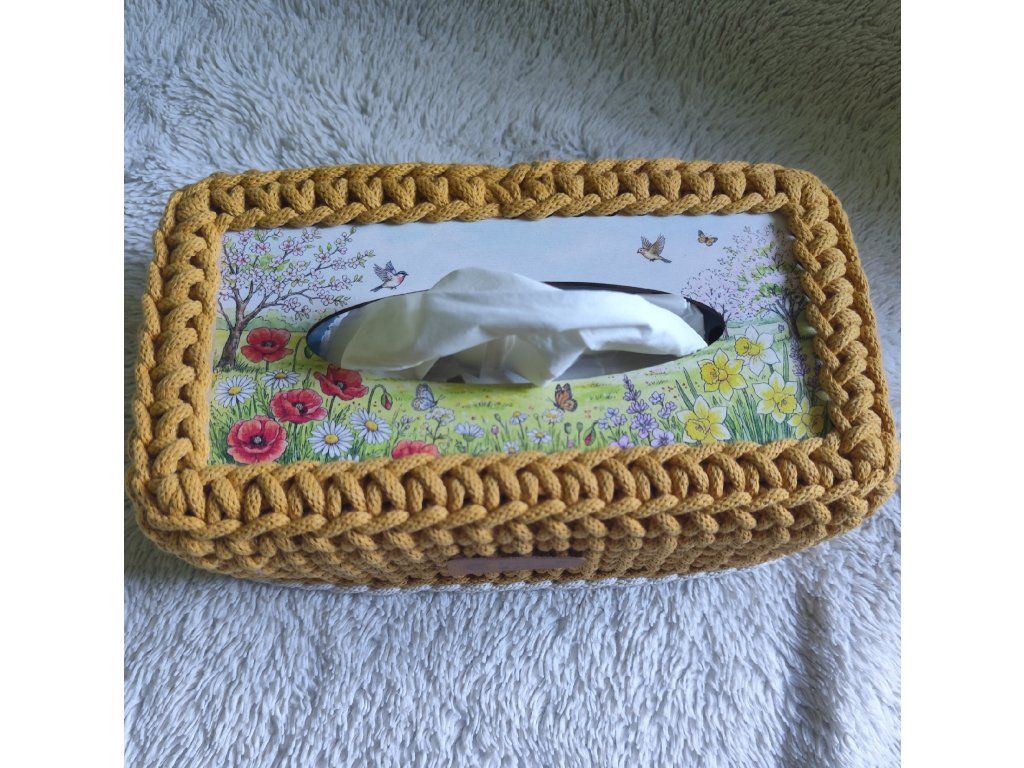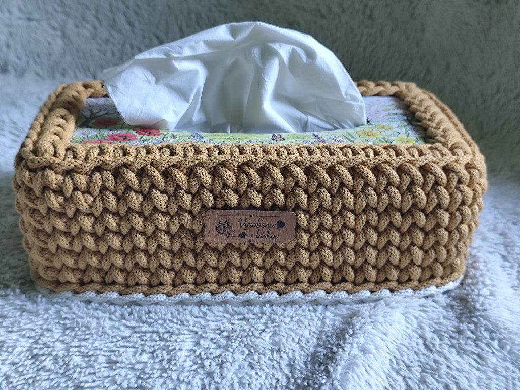 Tento háčkovaný obal je ideální pro ty, kteří chtějí praktičnost s elegancí. Skvěle poslouží jako úložný prostor pro vaše kapesníky a jako dekorační prvek do vašeho domova.